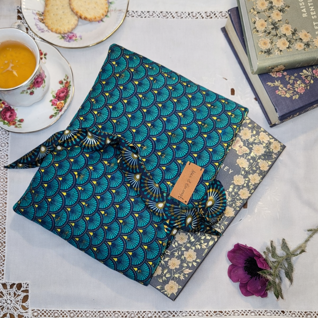 Très jolie pochette pour livre, en coton matelassé, munie de deux rubans pour la fermer. Fait main